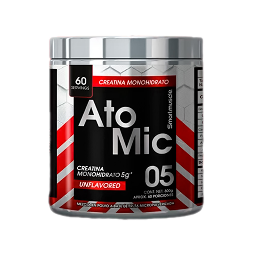 Atomic Monohidrato de SmartMuscle es un suplemento alimenticio en polvo formulado con creatina monohidratada y fruta micropulverizada, diseñado para complementar la nutrición en personas que realizan actividad física, especialmente en entrenamientos de fuerza y alta intensidad. Cada porción aporta aproximadamente 2.5 g de creatina monohidratada, una de las formas más estudiadas en nutrición deportiva por su biodisponibilidad y estabilidad.