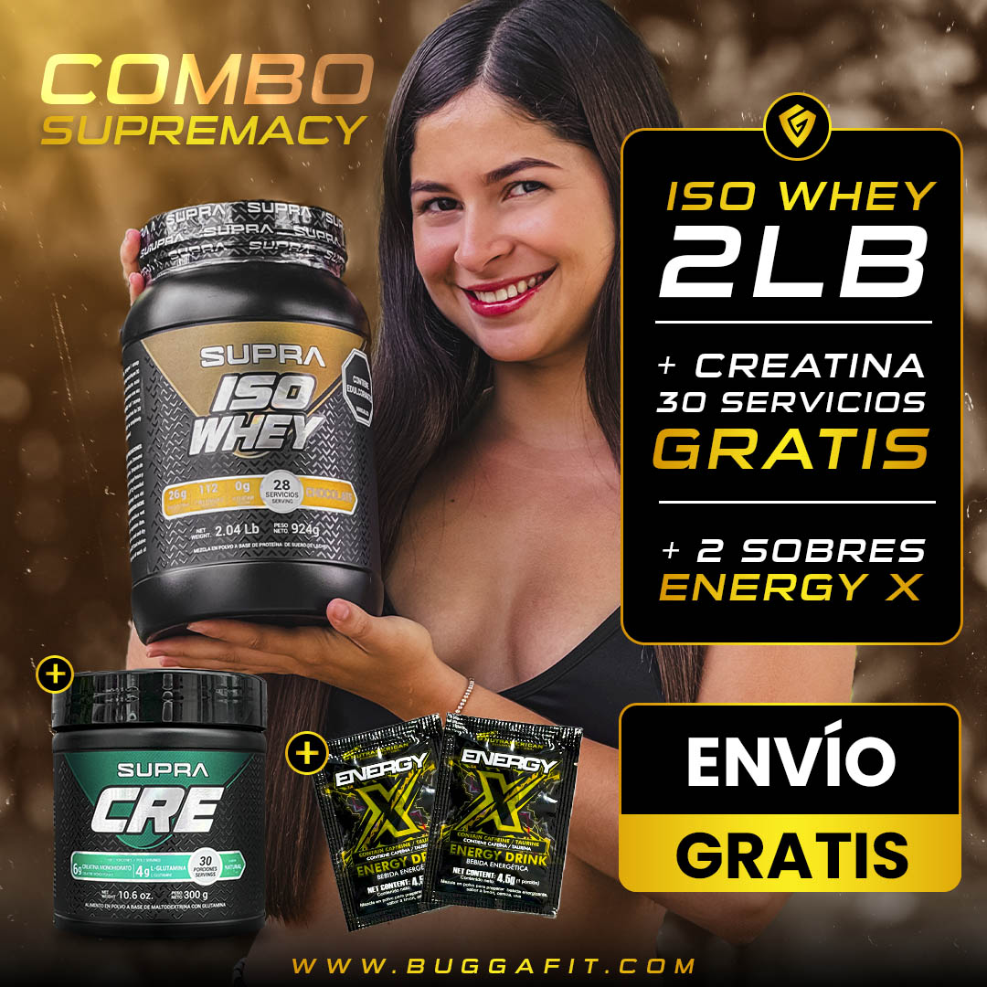 Adquiere nuestro Combo Supremacy con la inigualable proteína limpia 100% aislada ISO WHEY de 2LB de la marca SUPRA que incluye una creatina monohidratada + glutamina de 30 servicios de la marca SUPRA y dos sobres de Energy X de la marca Nutramerican Pharma.