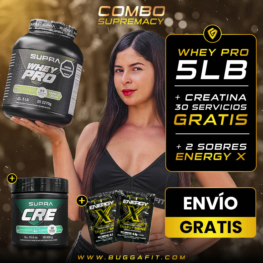 Adquiere nuestro Combo Supremacy con la poderosa proteína limpia (concentrada + asilada) WHEY PRO de 5LB de la marca SUPRA que incluye una creatina monohidratada + glutamina de 30 servicios de la marca SUPRA y dos sobres de Energy X de la marca Nutramerican Pharma.